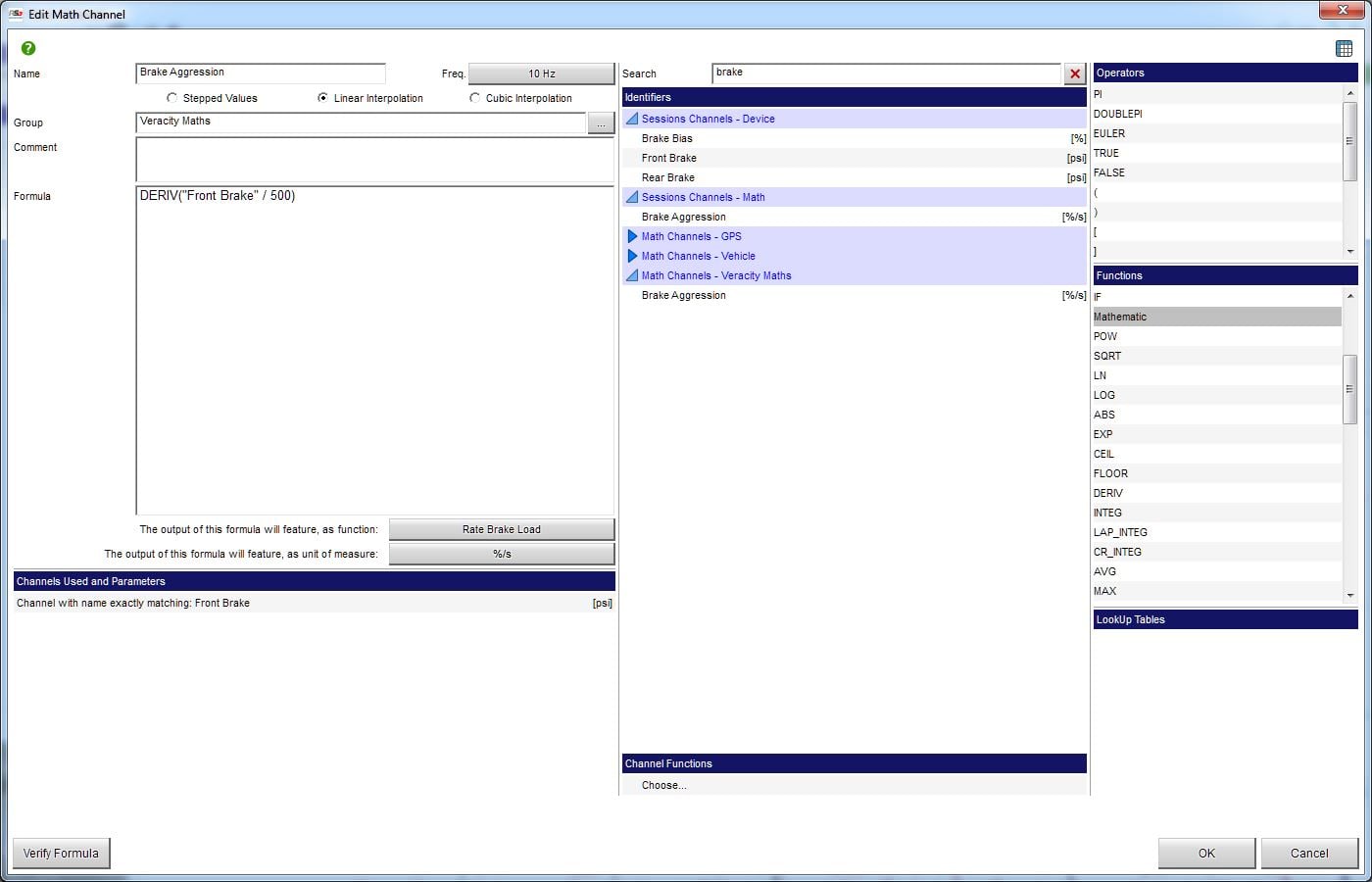 In RS3, I use something like Brake Aggression is DERIV("Front Brake" / 500) (where 500 is the normal maximum braking pressure). I set the output unit to "Percent/Sec" -> "Rate Brake Load".