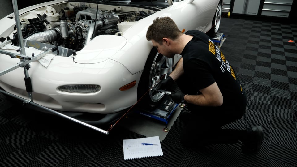 | 00:24 | If we're going to measure at the front of the tyre, measure at the rear of the tyre, say this is the front of the car here, obviously we've got toe out, that means we're going to measure a smaller distance at the front and a larger distance at the rear. |